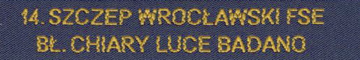 Naszywka 14. Szczep Wrocławski bł. Chiary Luce Badano, naszywa się na prawe ramię, powyżej herbu chorągwi.